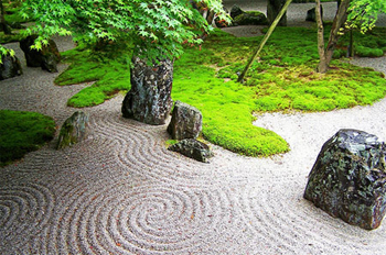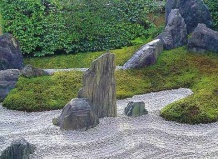 Японский сад камней - уникальное сооружение. Основная площадь его засыпана песком или мелкой галькой, а на ней как бы в беспорядке разбросаны группы неотесанных камней. Однако беспорядочность только кажущаяся. Расстановка камней на площадке - вид искусства, одно из главных умений садовника. Суть этого искусства в том, чтобы суметь в каждом камне увидеть свое "лицо" и свою "позу", и наделить определенной ролью в композиции: он будет лежать, прислоняться, убегать. По степени декоративной и смысловой нагрузки группы камней расставляют слева направо, так обычно скользит взгляд по картине, так же организовано движение по саду. Камни и валуны означают силу и стойкость. Будучи неподвижными, они излучают покой, а расположенные асимметрично, они наиболее созвучны с природой. Со временем они покрываются паутиной, обрастают мхом и лишайником, что делает их еще более органичными. Каменный сад может выглядеть так: подушки мха имитируют мягкие очертания сопок, а волнистые линии на мелком гравии, смешанном с песком, - подернутую рябью водную поверхность с выступающими из нее седыми утесами. Его называют также плоским садом или сухим ландшафтом. Сады камней функционально предназначены для медитаций, отстранения от мирской суеты и повседневных проблем. Конструкция подобных сооружений, подчиняясь нормам дзэн-буддизма, усиливает тягу японцев к любованию природой, размышлению, уединению. Здесь в явном виде выступают такие принципы как умение видеть прелесть обычного и изящество простоты. Площадка обнесена стеной примерно метровой высоты, подчеркивающей уединенность сада.