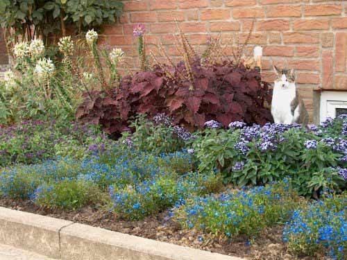 Небольшой палисадник в холодных розовых, фиолетовых, синих тонах создает впечатление сдержанности