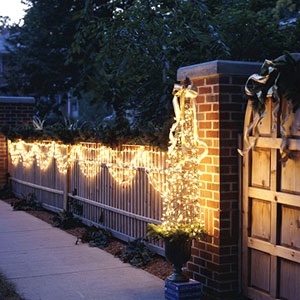 Украшенный такими гирляндами забор, видоизменится кардинально: будет казаться, будто изменилась сама его форма. Изящное деревце у колонны подчеркнет красоту забора.
