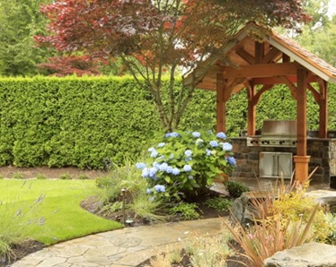 Кухня под открытым небом ни в чем не должна уступать кухне в помещении. Кроме плиты или гриля, любая садовая кухня должна быть оснащена зоной для хранения разнообразной утвари, а также рабочей зоной, где осуществляется разделка и приготовление пищи. Обязательным и незаменимым атрибутом кухни является мойка для мытья посуды и рук. Таким образом, весь процесс приготовления пищи происходит под открытым небом и вам не нужно постоянно курсировать между домом и кухней.
