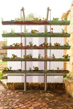 А как Вам такой летний душ, который украшает подвесной сад? Суккуленты, не требующие особого ухода, высажены в продолговатые контейнеры из состаренного металла, выглядят довольно эффектно на фоне полупрозрачных шторок, прикрывающих душевую. Оригинально, не правда ли?