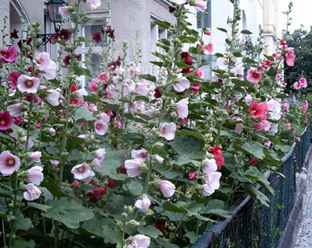 Для садов в деревенском стиле или в украинском этно-стиле замечательно подходит мальва или шток-роза, которую раньше выращивали практически в каждом палисаднике благодаря ее неприхотливости и роскошному цветению. Не зря о мальве, как о символе материнской любви поется в народных песнях. На самом деле мальвы растут в Америке и Африке, но уже давно распространены по всему миру. Как и у многих многолетников, мальва образует в год посева розетку листьев, а на второй год вырастает роскошный цветонос высотой до 2 м с выразительными, крупными цветами всевозможных расцветок от белого и нежно-розового до алого и почти черного. Особо пышно выглядят сорта с махровыми цветками.