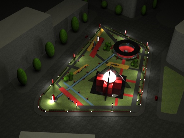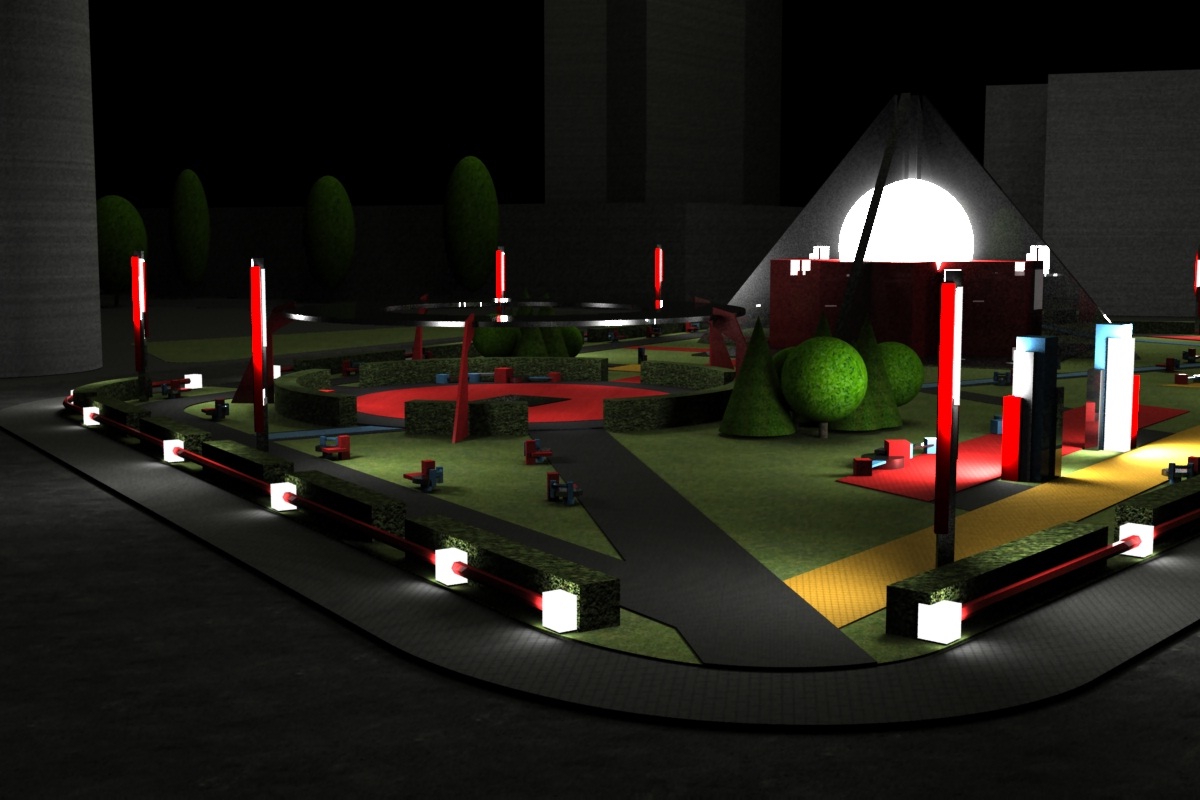 Площадь вокруг здания центра будет представлять собой озелененный сквер. Планировочное и цветовое решение, малые архитектурные формы и растения подчинены принципам супрематической живописи и скульптуры. В окружении однообразной застройки нынешней Львовской площади комплекс футурологического центра создаст яркий архитектурный и ландшафтный акцент.