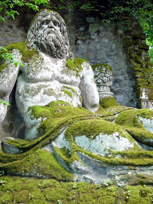 Здесь, на горе, поросшей лесом, прямо из скал выточены огромные фигуры, в основном мифологические персонажи. Первой нас встречает Голова Протея, сына Нептуна. На ней – земной шар, его венчает замок Орсини, что символизирует власть Орсини над миром. Далее мы видим огромную статую Битва Титанов. Здесь Геркулес разрывает Какоса. Зрелище не из приятных… Еще "милые" скульптуры – слон, пожирающий человека, собаки, напавшие на дракона, женщина с неестественно раздвинутыми ногами…