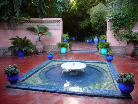 Войдя через узкие ворота, посетитель попадает во внутренний двор, по центру которого плещет пышный фонтан, украшенный изразцами зеленого и синего цвета: такого насыщенного синего цвета, что невольно завораживает и приковывает к себе взгляд. Отсюда главная дорожка терракотового цвета ведет в сад Мажорель – настоящий оазис посреди пустыни, соответствующий изысканным идеалам восточного сада, выглядящего, словно трехмерная картина из растений и архитектуры, созданная французским художником Жаком Мажорелем.