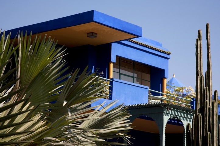 Повернув по аллее, Вы увидите дом пронзительно синего цвета, обрамленный ветвями высоких пальм, стволы которых увиты огненно-красной бугенвиллией. Даже яркая синь марроканского неба не сравнится со столь насыщенным тоном этого элегантного здания, напоминающего виллу с узкими колоннами в марроканском стиле, и в то же время являющегося современной бетонной постройкой с балконами и террасами.