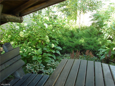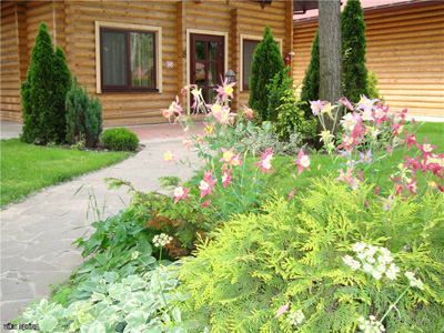 Важно также на стадии планирования придать мощениям и контурам цветников округлую, « обтекаемую форму». Посмотрите на тропинки, которые протаптывают в лесу люди и животные. Ни одного прямого угла, никаких резких или мелких изгибов, кричащих контрастов, которыми грешат начинающие садоводы. Только плавно текущие, огибающие препятствия линии. Для отделки мощений также нужно выбирать натуральные материалы: камень, дерево, галечник, для мульчирования- декоративный щебень или измельченную кору. Однако и здесь следует избегать геометрических форм, четких орнаментов и контрастных сочетаний цветов, которые иногда применяются в современном дизайне. На участках, расположенных в лесу, где между сомкнутыми деревьями света особенно мало, можно мульчировать поверхность опавшей хвоей и сосновыми шишками. Выглядит такая мульча очень естественно и оригинально, к тому же практически бесплатна. Очень красиво вписываются в ландшафтный (природный) стиль участка имитации воды или «сухого русла», воссоздаваемые с помощью гальки или мелкого гравия, возможно с мостиком, водные устройства в виде родника, « плачущего камня» , дорожки из отдельных плит, межу которыми постепенно вырастет мох или самосевные почвопокровники. Рядом с дорожкой вкопайте «вросшие в землю» валуны, обветренные и покрытые лишайниками.