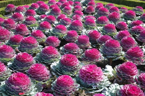 Если ранним летом красивый декоративный эффект задают зеленые и цветные головки салата-латука, то у же во второй половине года изюминкой декоративного огорода являются белокочанная и краснокачанная капуста с белой и сине-фиолетовой окраской. Мягкий климат Франции создает все условия для выращивания растений семейства Капустные, выдерживающих до -10 °C.