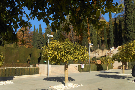 Ранее между Альгамброй и дворцовой частью Хенералифе существовал мост для перехода, но сейчас он разрушен. Туристы, посещавшие Альгамбру, попадают в Хенералифе по новому мосту с северной оконечности сразу к театру. Ведущая сюда аллея засажена не встречающимися во внутренних садах дворцов декоративными растениями, полыхающими всеми красками осени . Затем она плавно перетекает в Променад из кипарисов ( Paseo de las Adelfas), ведущий к исторической части Хенералифе.