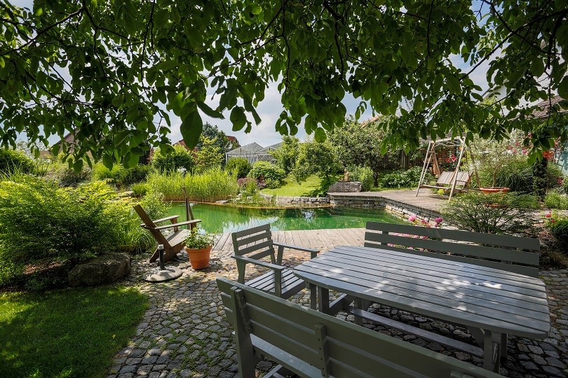 Водные объекты завоевали свое достойное место в оформлении английского коттеджного сада. С помощью винных бочек, поилок для птиц или резервуаров можно создать в небольших садах миниатюрные водные композиции. Если же Ваш сад имеет большую площадь, естественный пруд с небольшим садовым домиком станет идеальным дополнением Вашего коттеджного сада в английском стиле. Красивый естественный водоем вносит разнообразие в сад, созданный в английском стиле, а благодаря соответствующим растениям, оформляющим его берега, гармонично вписывается в окружающий пейзаж.