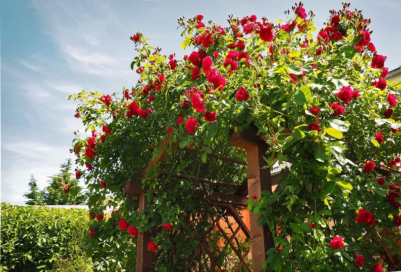 Когда речь идет о стиле старого английского коттеджа, то сразу вспоминаются арки, увитые розами. В саду этого стиля особое место занимают розы рамблеры – легкие в уходе, выносливые плетистые розы, подкупающие роскошью махровых цветов, чарующими ароматами и яркими красками. Их гибкие длинные побеги достигают до 10 м в длину и красиво увивают старые плодовые деревья. В качестве альтернативы розам рамблерам в английском саду найдут свое место и другие вьющиеся растения: глициния или клематис.