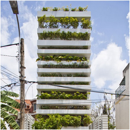 Сайгон (Вьетнам) – хаотичный город с самой высокой плотностью населения в мире. Местные жители стараются разнообразить и разбавлять безликие однотипные и плотно прилегающие друг к другу строения цветочными горшками, выставленными на балконы и подоконники. Авторы данного проекта решили не идти по стандартному пути, а создали Stacking Green - дом-сад, в котором озеленение является неотъемлемой частью архитектуры.