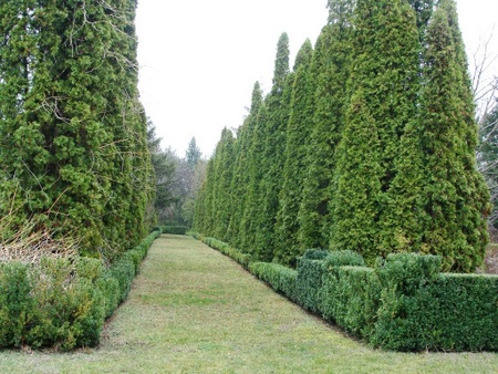 Мы с восхищением смотрели на хорошо продуманные, красивые парковые композиции, аккуратно подстриженные живые изгороди из самшита и туи, топиарные формы из них. Удивлялись как такие экзотические виды деревьев и кустарников могли попасть в этот сельский парк в глубинке.
