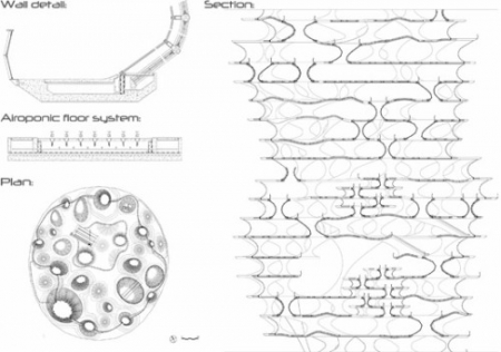 Спроектированная для района Хадсон Ярд, Манхеттен, Dystopian Farm направлена на обеспечение Нью-Йорка рациональным источников продуктов, в то же время создавая динамическое социальное пространство, объединяющее производителей с потребителями. Биоморфический небоскрёб спроектирован наподобие клеток растения и обеспечивает пространство для ферм, жилых площадей и рынков. Эти органические конструкции будут оснащены особыми системами, такими как аэропоническая система поливки (аэропоника - воздушная культура, выращивание растений без почвы или её заменителя), технология питательной среды, система контроля уровня света и СО2, чтобы удовлетворить потребности будущего населения в пищевых продуктах.