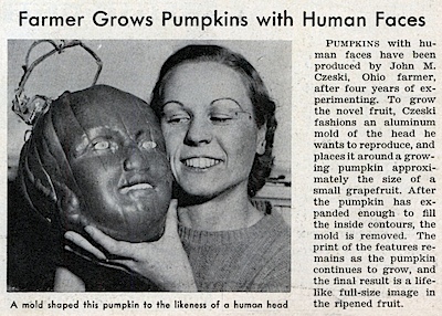 Тыквы с человеческими лицами были выращены Джоном Чески, фермером из Огайо, после 4-х лет экспериментов. Чтобы вырастить доселе невиданный плод, Чески сделал алюминиевую пресс-форму головы, которую он хотел воспроизвести, и поместил ее вокруг растущей тыквы, размером примерно с небольшой грейпфрукт. После того, как тыква разрослась достаточно, заполнив внутренние контуры, пресс-форма была снята. Отпечаток лица оставался по мере того, как плод рос, и в результате получился плод с полноразмерной, очень похожей на живую, головой.»