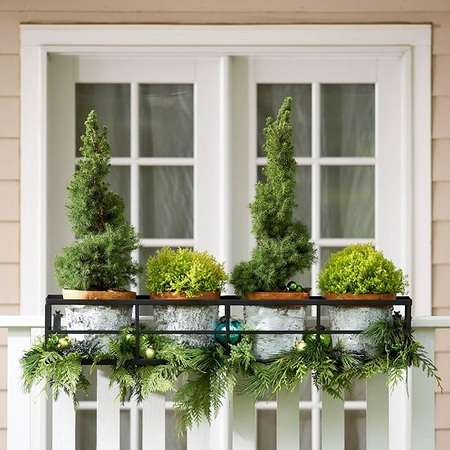 Здесь использована схема повторения (что всегда актуально для внешних украшений), два вида горшечных вечнозеленых – вертикальное и горизонтальное (поочередно), в основе композиции – белые горшки, а связывают все элементы воедино ветки туи, проложенные между горшками.