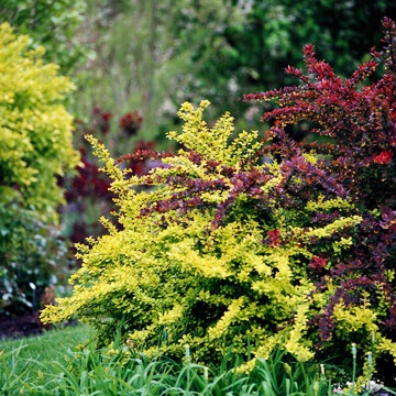 Барбарис Тунберга 'Aurea' имеет светло-зелёную листву с желтоватым оттенком (смотрите, как нарядно смотрятся два барбарисовых куста на следующей фотографии: барбарис Тунберга 'Aurea' и барбарис Тунберга 'Dart's Red Lady'!). Этот сорт барбариса является медленно растущим и по окончанию лета сбрасывает своё яркое одеяние. Размеры куста этого сорта: максимум 1.5 м в высоту и 1.8 м в ширину. Зоны его зимостойкости - 5-8 (т.е. мороз до –35 ºС ему не страшен).