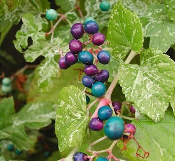 Отличается декоративными листьями и плодами виноградовник (Ampelopsis). Такое чувство, будто кто-то экспериментировал с акварельными красками: собранные в гроздья округлые ягоды декоративной лианы переливаются оттенками розового, бирюзового и светло-голубого.