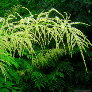 Волжанка двудомная (Aruncus dioicus) - это также травянистый многолетник выростающий до 2 метров с душистыми соцветиями метелками, похожа на кустарник. Существует около 12 видов этих растений. Все они крупные, с красивыми дважды или трижды сложными листьями. Любит тень.