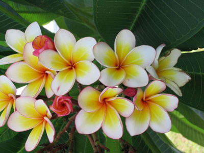 Франжипани, достигающий до 5 м в высоту, принадлежит к семейству кутровые. Его собранные в пучки листья длиной до 40 см и 2-4 см в ширину очень прочные и крепкие. Уже у молодого растения по окраске листьев приблизительно можно узнать, какие будут у него цветы. У плюмерий, цветущих красными цветами, листья имеют темную, даже красно-коричневую окраску. А у растений с белыми или желтыми цветами листья от светло-зеленой до темно-желтой окраски. На верхушках суккулентных побегов располагаются крупные соцветия из цветков с пятью воскообразными лепестками. Цветы разнообразной формы и оттенков впечатляют своей изысканной красотой и приятным, чувственным ароматом, который особенно интенсивен в утреннее время. Поэтому цветы франжипани широко применяются и в парфюмерии. Все части растения содержат млечный сок, выступающий при малейшем повреждении, который может вызвать раздражение кожи и аллергические реакции.Помните об этом!
