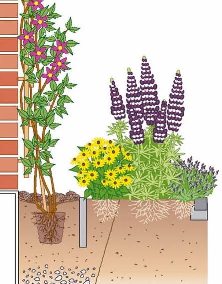Если по соседству с клематисом растут доминирующие многолетники, как, например, манжетка или герань крупнокорневищная, то лиану следует защитить, отгородив ее корни от корней растений-соседей пленкой или бетонным бортиком.
