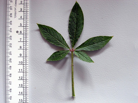 Растение образует прочный, ветвящийся в верхней части стебель, древеснеющий внизу. Листья двух типов: верхушечные – цельные, небольшие, серединные – крупные, непарноперистые, состоят из 5-7 ланцетных листочков, зазубренным по краям. Листья черешковые, светло-зеленые, расположены в очередном порядке. На жилках листьев с нижней стороны и на стебле имеются колючки, основание листьев снабжено парой жестких колючих шипов (отсюда и видовое название растения). Стебли и листья покрыты липкими железистыми волосками, которые выделяют вещество со своеобразным запахом.