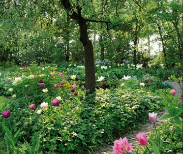 Александра Пристин выбрала для своего сада выносливые растения, которые отлично размножаются. Так, здесь можно встретить лучезарно белую анемону нежную Anemone blanda, очень похожую на ветреницу дубравную. Задний план украшают нарциссы триандрусовые 'Thalia'. Еще в бутонах, но вскоре раскроются во всей своей красе и тюльпаны 'Purissima', придающие саду вертикальный акцент. Эти тюльпаны отличаются своей живучестью и поэтому являются одними из самых популярных среди белых тюльпанов.