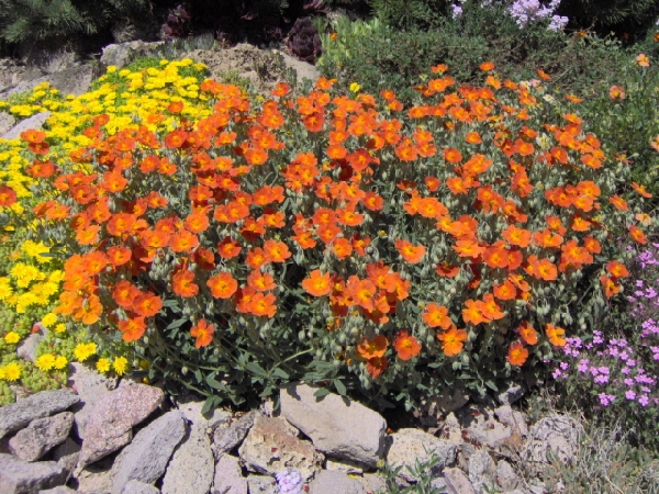 Есть несколько популярных компактных кустарников, которые замечательно подходят для любой клумбы, альпийской горки, сухой стенки или посадки в контейнере, на балконе или террасе. Обратите внимание на многочисленные сорта солнцецвета монетолистного (Нelianthemum nummularium), произрастающего в южной части Европы, а также Малой Азии. Это сильноветвистый полукустарник, образующий рыхлые дернины высотой 10-35см с небольшими овальными или ланцетными листьями. С июня по август он покрыт множеством изящных цветочков, в зависимости от сорта простых или полумахровых, желтых, оранжевых или розовых тонов по 3-12 в завитках. Цветы открыты только в солнечную погоду.