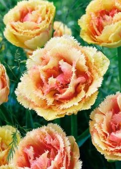 Своеобразной изюминкой является, например, новый тюльпан, Германия. Густомахровые цветы с нежной игольчатой бахромой по краям лепестков в сочетании с изысканной желто-оранжевой окраской делают этот новый сорт настоящей находкой для весеннего сада. Бахромчатые цветки появляются с апреля по май на 40-сантиметровых, прочных стеблях и держаться довольно долго. Поэтому идеально подходят для создания романтических букетов. Эффектно смотрятся новые тюльпаны в миксбордерах, рабатках и в палисадниках. Если посадить несколько луковиц в широкую чашу или цветочный горшок, распустившиеся бутоны придадут балкону или террасе романтический шарм. Особенно импозантно выглядят эти тюльпаны в больших группах.