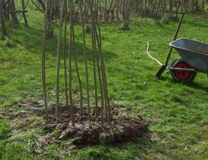 В зависимости от того, какое должно быть будущее изделие, в землю или в цветочный горшок вставляются более толстые прутья, колья, формируя при этом желаемую форму. Они будут служить скелетом изделия. При этом для устойчивости колья заглубляют в землю примерно на одну треть. Если Вы желаете создать живое плетеное изделие, срезанные ивовые прутья просто воткните во влажную землю. Они очень быстро приживаются, продолжают расти и зеленеют. Побеги ивового изделия необходимо регулярно подрезать, так как они могут вырасти до нескольких метров в высоту. Если нет необходимости, чтобы ивовая скульптура пустила корни, нижние концы кольев, которые будут служить опорой, хорошо зачистите ножом и воткните в землю. Однако следует помнить, что если использовать в работе ивовые прутья, которые отличаются высокой приживаемостью, то, несмотря на все противодействия, они все равно могут пустить корни и зазеленеть.