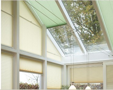 Внутренняя солнцезащитная система в большинстве случаев выглядит довольно эстетично. Обычно внутренние системы солнцезащиты представлены такими видами, как изящные жалюзи, роллеты или рулонные шторы. Однако между стеклянной поверхностью и солнцезащитной системой образуется теплая воздушная подушка, поэтому такую форму затенения рекомендуется применять при хорошей вентиляции. Внутреннее затенение можно использовать при любой погоде, в этом случае снаружи внутрь проникает до 60% солнечной энергии. Существуют конструктивные решения для крыши любой формы, включая поверхность кровли.