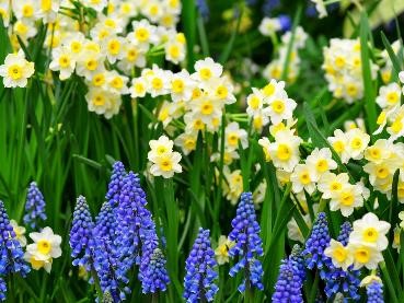 Третью группу образуют мышиные гиацинты или мускари (Muscari) с видами всех оттенков синего. Первым стартует мускари лазоревый (Muscari azureum), его небесно-голубые соцветия появляются уже в первой-второй декаде апреля. В природе этот вид обитает на сухих горных склонах, поэтому совершенно не выносит переувлажнения. Мускари лазоревый, он же гиацинтик, хорошо растет на солнечных участках. Очень удачно их сочетание с ослепительно-белыми сортами ифейона одноцветкового (Ipheion uniflorum), мелкоцветковыми нарциссами, а также с такими дикорастущими тюльпанами, как тюльпан Кауфмана (Tulipa kaufmanniana), тюльпан карликовый (Tulipa humilis) и тюльпан превосходящий (Tulipa praestans).