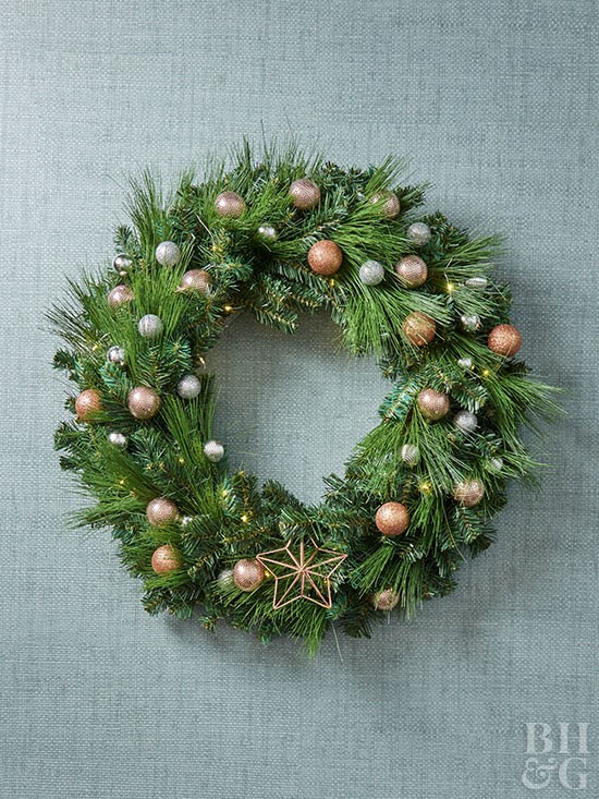 Этот венок с металлическим блеском отлично дополнит Рождественскую елку в Вашей гостиной. Чтобы венок выглядел более пышным дополните его сосновыми веточками, добавьте мерцающую гирлянду и металлические украшения золотистого, серебряного и медного оттенка. В завершение поместите в центр сверкающую звезду. Подробные инструкции Вы найдете здесь
