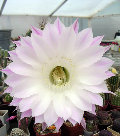 Предоставьте эхинопсисам обилие солнечного освещения, приток свежего воздуха, сухую холодную (6-10°С) зимовку и они отблагодарят вас ежегодным цветением. Окраска крупных по размерам (до 15 см в диаметре) цветков настолько разнообразна, что направленный отбор «чистых» эхинопсисов и их гибридов потребовал разработки специальных каталожных таблиц для устойчивого закрепления цветовой гаммы. Каждому оттенку лепестков приставлена своя школа, а сами растения носят при этом звонкие названия типа «Дездемона», «Спящая красавица», «Дон Жуан» и другие, не менее интригующие.