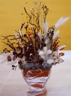 В цветочных аранжировках широко применяются засушенные семенные коробочки всяческих растений с оригинальной конфигурацией, сушеные тыквочки, хвойные шишки. Очень симпатично смотрятся в сочетании с цветами небольшие декоративные тыквы разных цветов и форм, которые годами не теряют своей привлекательности. Особую пикантность и обаятельность флористическим композициям придают красиво изогнутые побеги, искусно высушенные листья и живописные веточки древесных растений.