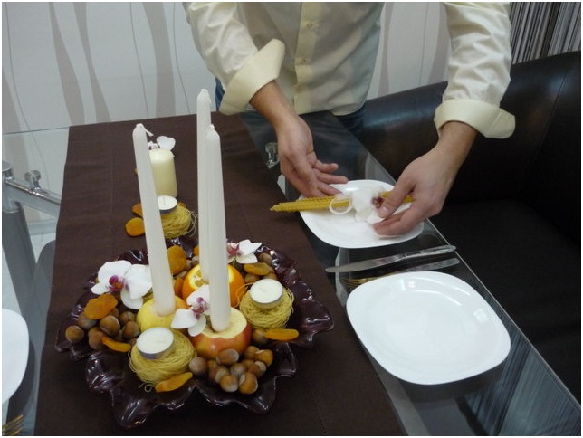 Для этого нам потребуются: поверхность (стол вполне подойдет), тарелки, бокалы и столовые приборы. Украшение будет состоять из подсвечников, свечей и только что сорванных орхидей.