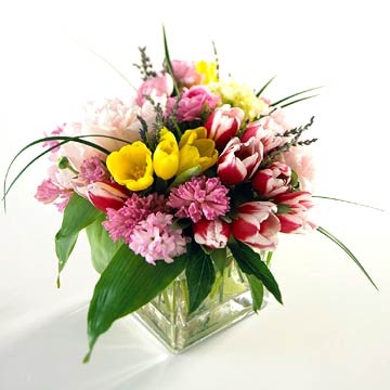 Яркая композиция из весенних цветов без слов поздравит с Днем Святого Валентина гораздо лучше, чем традиционные розы. Подберите самые свежие цветы и просто поставьте букет в прозрачную квадратную вазу.