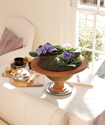 Покупаем 3 узамбарские фиалки разных цветов и садим в одну урну. Закрываем землю мхом (мох можно купить практически в любом садовом центе/питомнике).