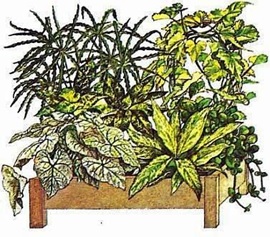 Объединить в одну группу, составив при этом красивую композицию, можно такие разные виды растений, как вьющийся абутилон, ампельную эписцию, кустистую аглаонему, диффенбахию, а также каладиум и дизиготеку. Так как все эти растения имеют разную потребность в воде, они должны расти в отдельных горшках. Некоторые растения, предпочитающие тень, можно разместить под листьями других растений. Когда заканчивается период цветения эписции, ее можно заменить низкорстущей фиттонией.