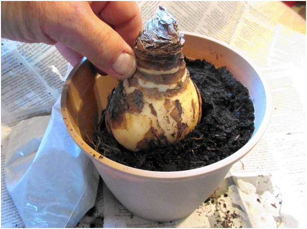 Посадите луковицы в питательную горшечную грунтовую смесь, которую несложно купить. Заглубите луковицу до ее горлышка в горшечный компост и не повредите корни растения. Уплотните почву так, чтобы луковица сидела в почве после посадки надежно.