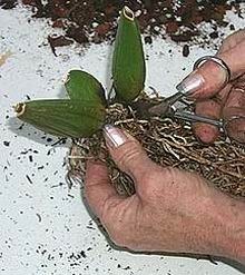 Здесь мы взяли для примера Beallara, которая слишком разрослась для своего горшка и нуждается в пересадке. Все новые росты и корни, которые растение дает за пределами горшка, не смогут войти в контакт с субстратом и нормально питаться. Мы удалим бульбы, как будет показано ниже.