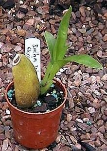 Это задняя бульба Coelogyne massangeana, которую проращивали в пакете . Как вы видите, она отлично растет и достигнет размера цветения примерно через 3 года или раньше.