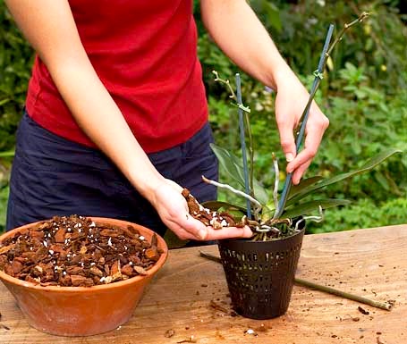Свободное пространство между корнями заполняется с помощью деревянной палочки, например, бамбуковой, слегка прижимая субстрат, но, не уплотняя его излишне. И здесь нужно быть очень внимательным, чтобы не повредить растение. После пересадки полейте орхидею не раньше, чем через 5 дней, чтобы вместе с водой на свежие раны не попали возбудители болезней. При этом каждый день опрыскивайте листья. Не спешите также и с внесением удобрений. Начинайте подкармливать орхидею через 3-4 недели.
