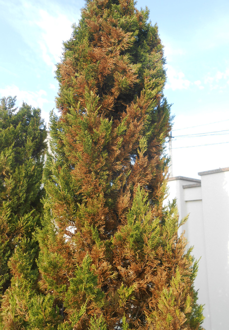 6. Усыхание ветвей можжевельника вызывается множеством патогенных грибов, среди которых чаще встречаются Cytospora pini, Diplodia juniperi, Hendersonia notha, Phoma juniperi, Phomopsis juniperovora, Rhabdospora sabinae, Pythium cupressina. Конкретный вид возбудителя можно определить в лаборатории при микроскопическом исследовании. Внешне болезнь проявляется весной сначала в виде пожелтения и усыхания хвои и мелких веточек, а позже их опадания, захватывающего все большие площади. Такая патология может привести не только к потере декоративности, но и к гибели всего растения. Позже на хвое и коре образуются многочисленные мелкие темноокрашенные плодовые тела грибов.