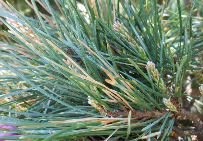 4. Пузырчатая ржавчина хвои сосны - возбудители грибы рода Coleosporium Lev., поражают молодую хвою сосны обыкновенной, веймутовой, горной и черной. В апреле-мае появляются светло-окрашенные плоские спермогонии, позже в июне начинается спороношение в виде расположенных рядами перидермиев - пузырьков величиной 3 мм ржавого цвета, после чего хвоя буреет и усыхает. Промежуточными хозяевами развития спор являются крестовник, девясил, мать-и-мачеха, осот, смородина и т.п. Осенью споры созревают и переносятся ветром и другими способами на ветви можжевельников, снова заражая их. Одним из признаков поражения может быть смолотечение. Сильно пораженные растения лучше уничтожить полностью, поскольку они являются источником инфекции.